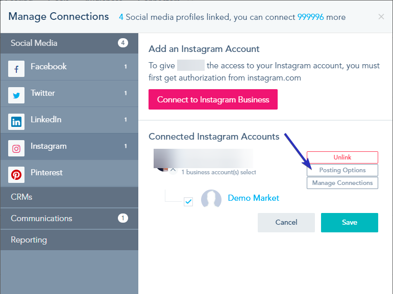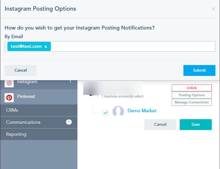 The platform supports posting automatically to Instagram, but you can also setup email notifications to team members with the date and time of the post. To change the email that receives the notifications, click on Posting Options.