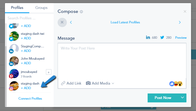 Choose your linked Instagram Account(s) by clicking on +ADD