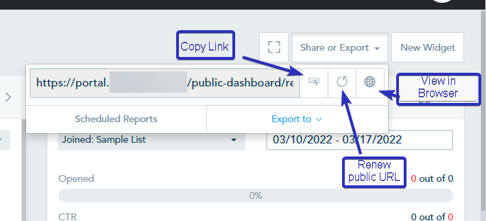 Viewing your dashboard via a public URL which you can share with colleagues or clients. The URL has a private token that can be renewed to revoke access for the old URL. To preview the publicly accessible version of the report you can click on the View in Browser icon.