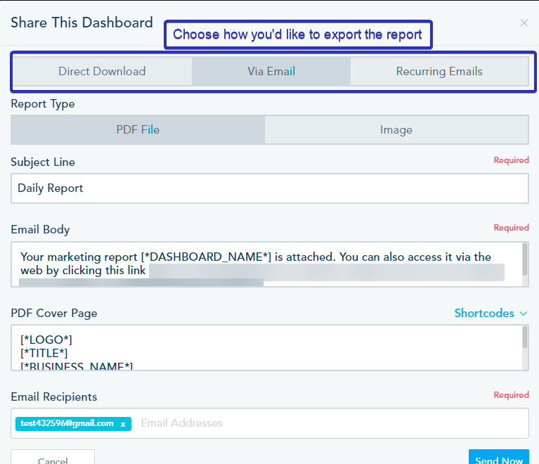 Managing your scheduled reports for different dashboards. First click on Scheduled Reports --> New Report. Second, select the desired Dashboard, configure the report email (subject line, body, recipients and frequency of sending) then click on Save.