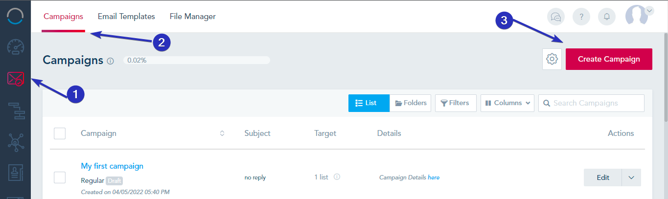 To create a new email campaign, go to Email tab -> Campaigns, and click on Create Campaign. The wizard will walk you through the 4 stages of the campaign creation: