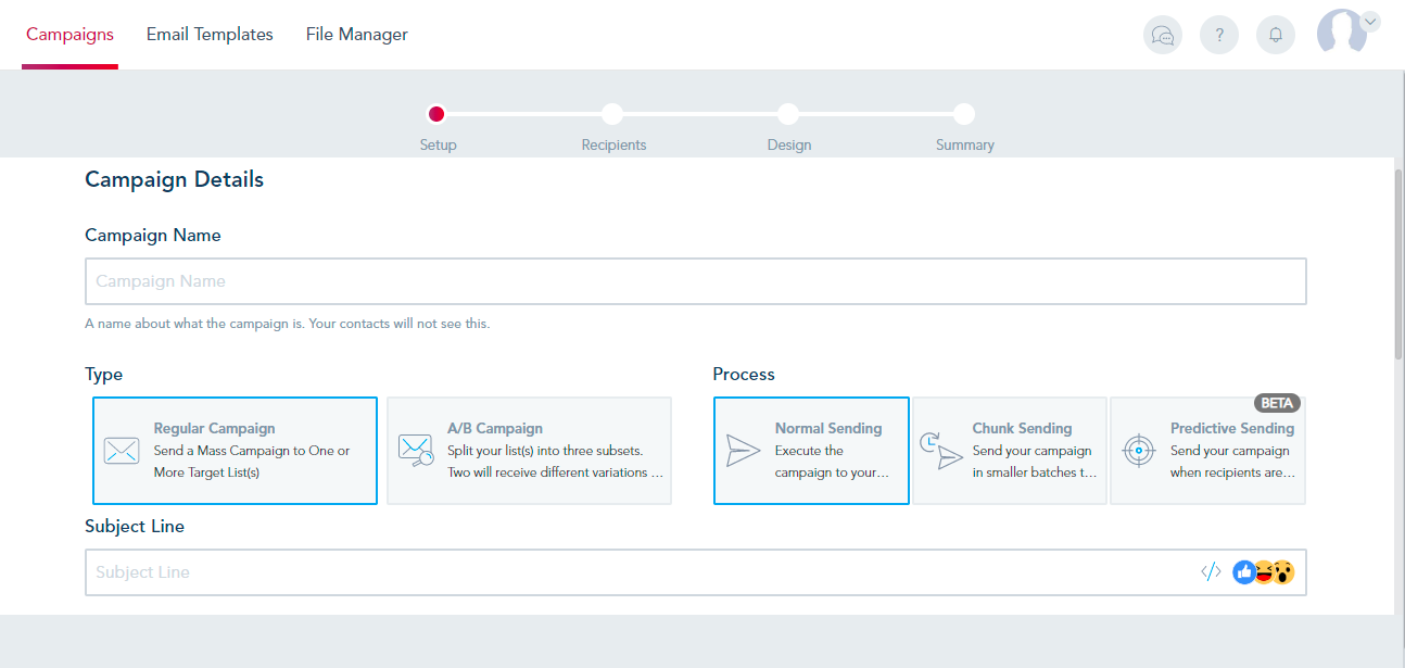 Setup: This is where you specify the campaign details like the campaign name (used internally), subject line, the type (Regular vs A/B testing), and other details. If you are setting up an A/B testing campaign, follow the additional options prompted on the screen to complete the AB testing criteria.