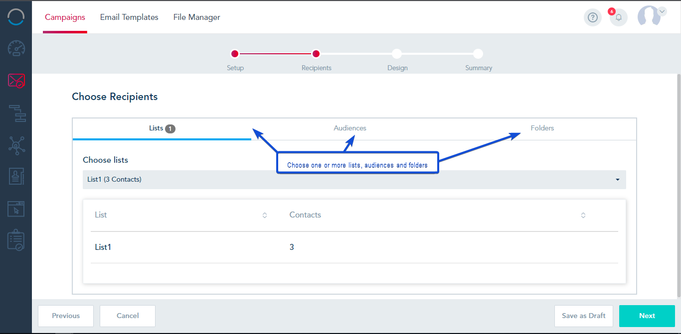 Lists: On this step, you can choose who are you targeting between your Lists, your Audiences, and your Folders. You can always choose a combination of all. If duplicates were detected, the system will send the contact one email only.