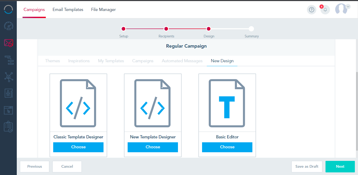Design: On this step, you have the option to start your email from a ready template, use a prebuilt template, recycle an old template or create a new one from scratch. If you choose New Design you will have the option to either create a simple text email via Basic Editor or to design your own via Template Designer.