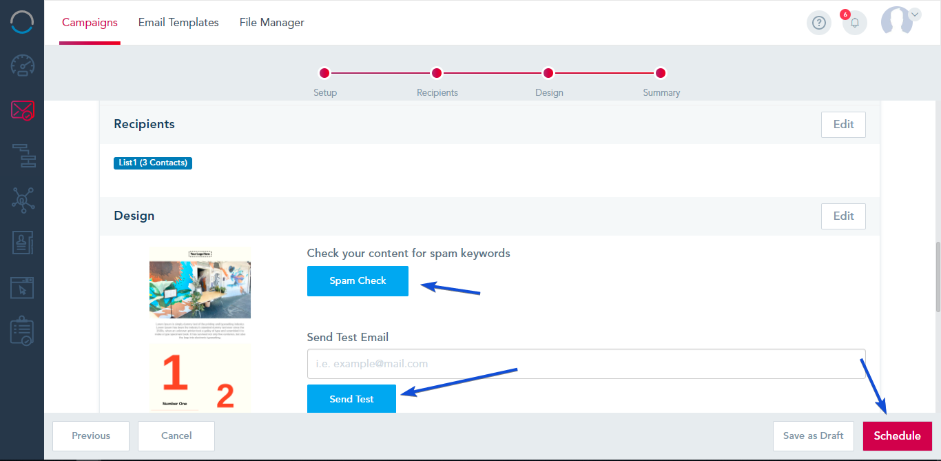 Summary: This is the last step of the campaign where you can review your setup, run a spam check on your campaign and send a draft email to yourself.