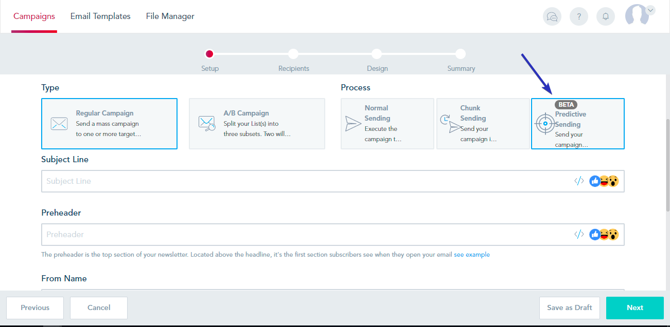Once you create a campaign, you will have the choice of the process between Normal sending or chunk sending, or Predictive sending: