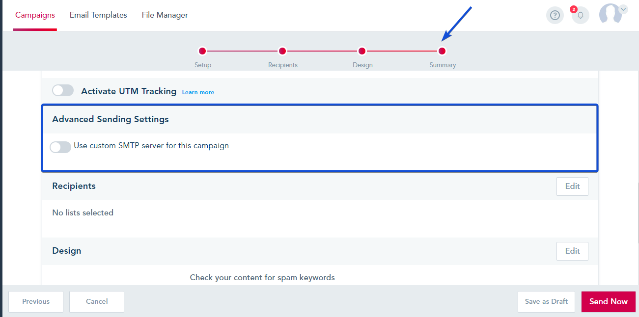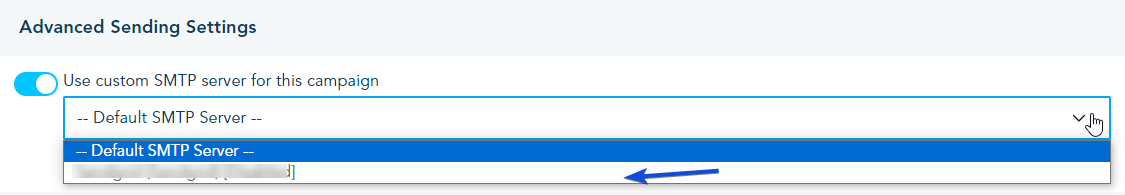 To send your campaign using a specific SMTP server rather than the default one, enable the Use custom SMTP server option.