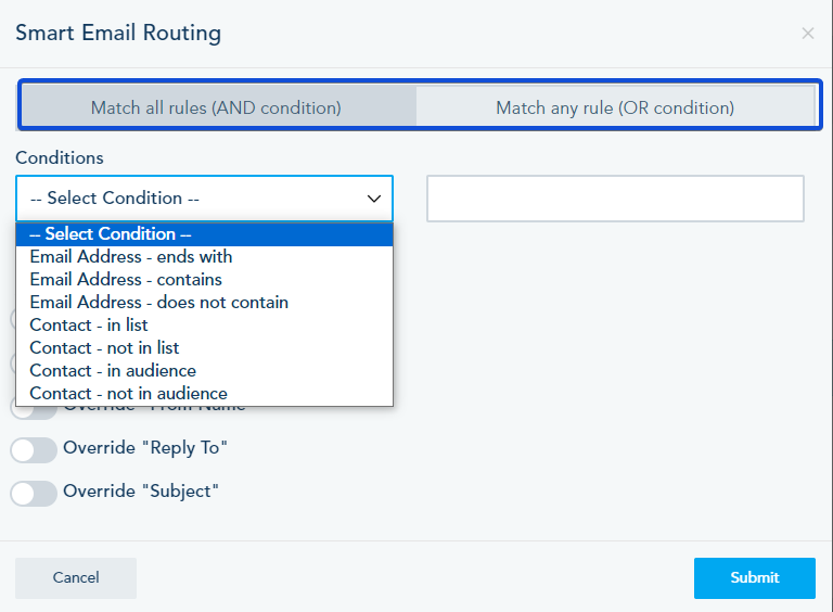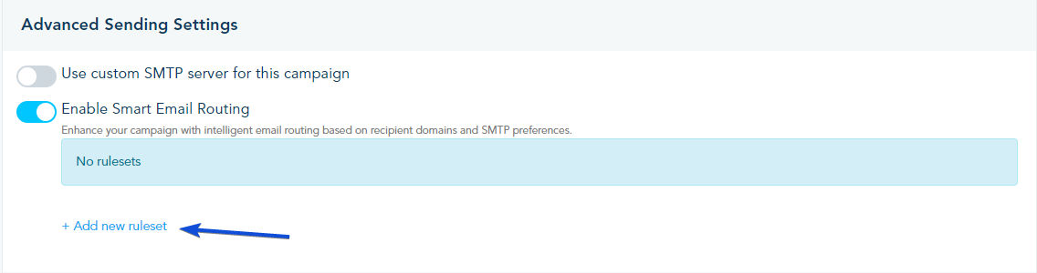 Activate the Smart Email Routing option to apply specific sending rules based on conditions. This feature allows you to set unique settings for different groups of contacts within the same campaign.