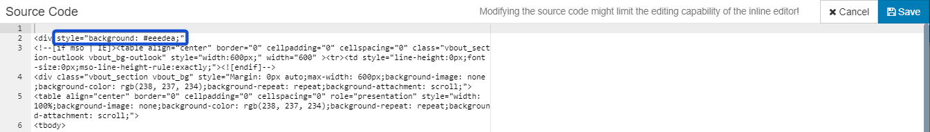 In the Source code add the following code inside <div>: style="background: #color code" .