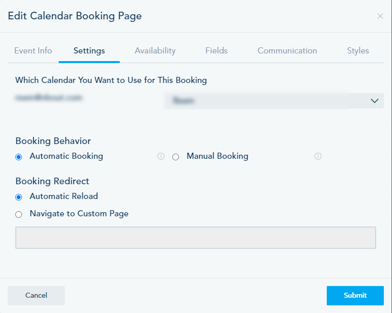 Settings: Choose the calendar you want to use, if the booking should be automatic or manual, and the redirection behavior.