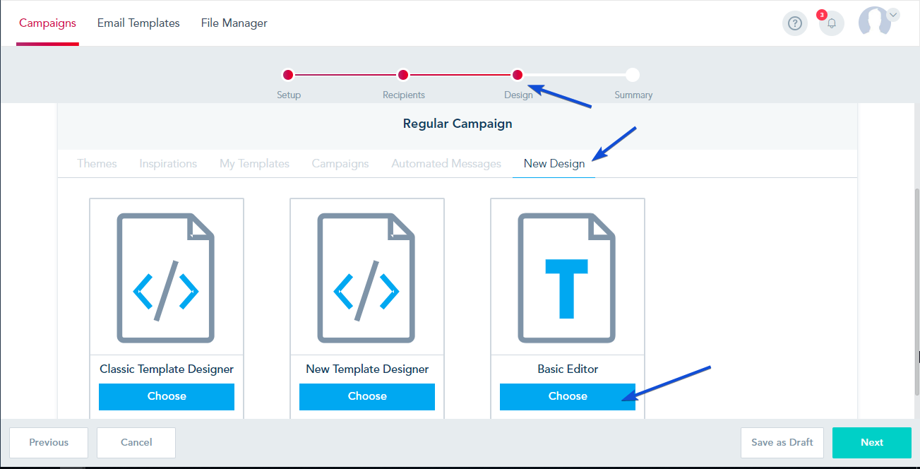 To create your campaign using the plain text editor, once you reach the design section, choose Basic Editor: