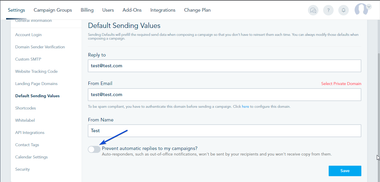 To prevent automatic replies such as out-of-office emails to your campaigns, go to Settings > Default Sending Values and toggle on the option below: