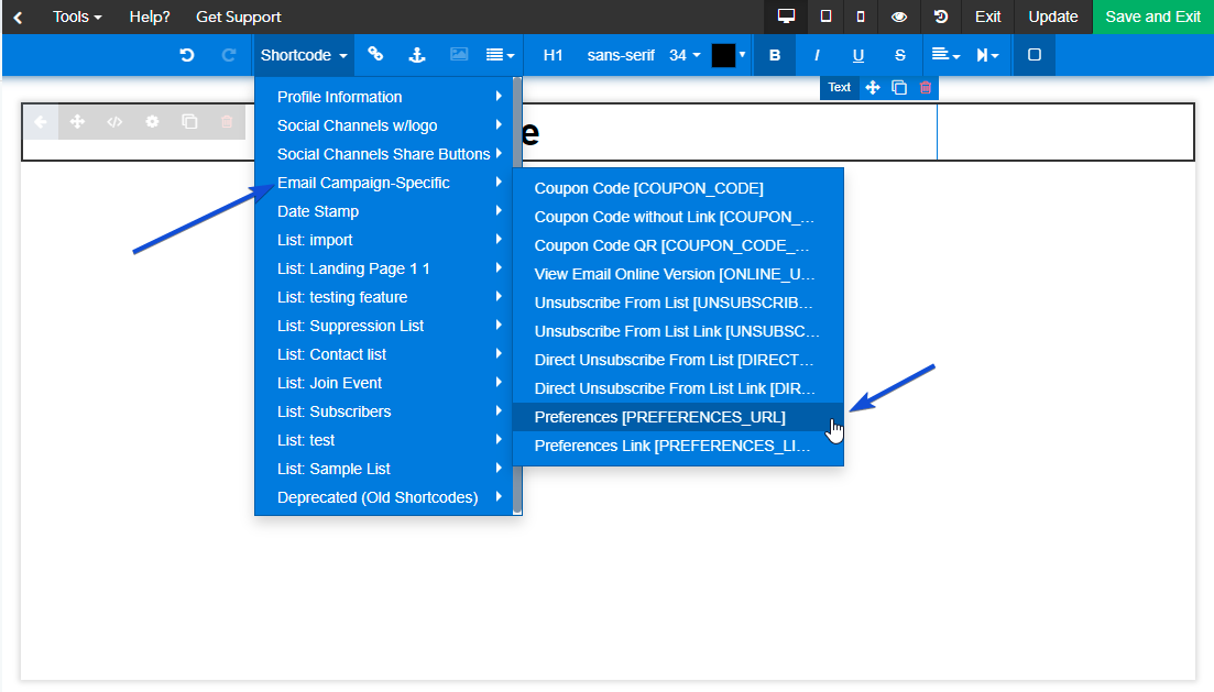 1- Choose the Preference option from the Shortcode, when sending an Email Campaign or composing an Email Automation Template.