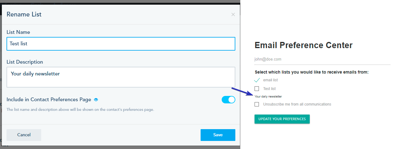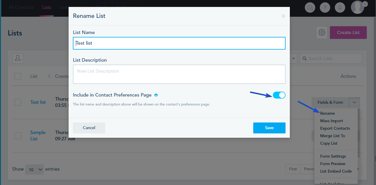 2- To include a list or hide it from the preferences tab, go to Rename option of your list and turn on Include in contact Preference Page.