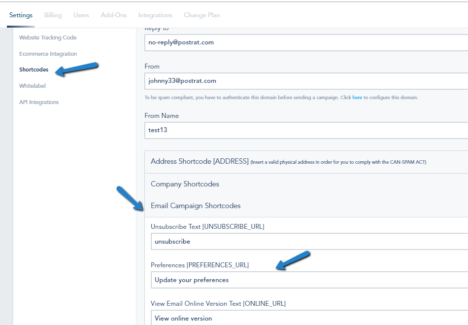 4- To modify the default text for the preferences shortcode, go to Settings > Shortcodes and expand the Email Campaign Shortcodes Tab.