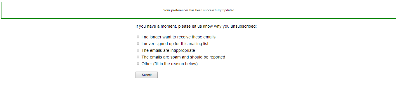 9- Once the recipient chooses which list to unsubscribe from and click Update your Preferences, they will be taken to the next screen: