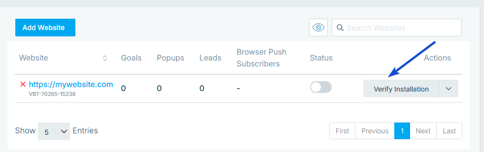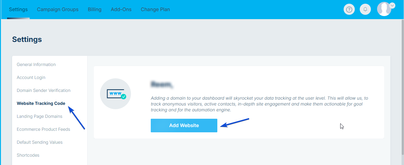 Tracking the engagement of your contacts on your website is crucial for effective analysis and functionality within the platform, including Conversion Goals, Lead Scoring → [Web Engagement], Popups, Audiences→ [Web Engagement]. Follow these steps to add your website URL and generate a custom tracking code: