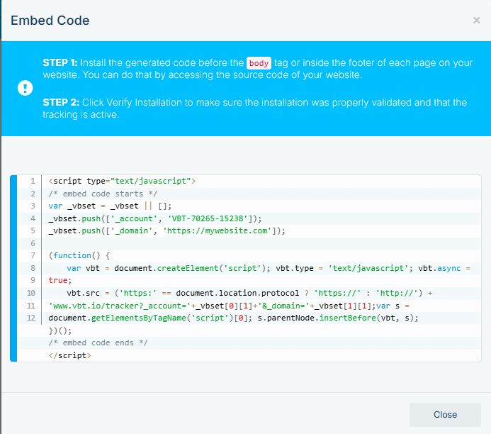• Install the generated code either before the body tag or inside the footer of each page on your website.