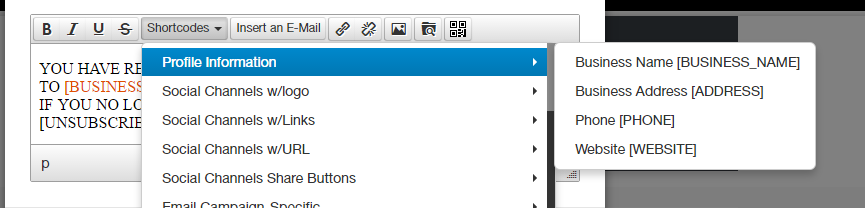 The platform provides shortcodes to your company information for easy insertion inside your campaigns.