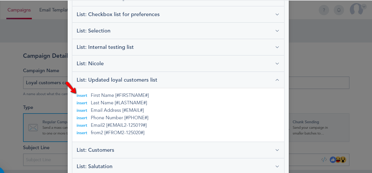 Click the desired Shortcode and it will appear in the Subject Line of the campaign.