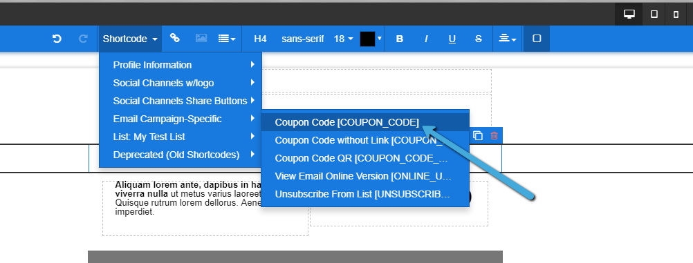 To add a Coupon Code to your campaigns, click on the Shortcode option section on the Builder's top Toolbar under Email Campaign Specific or add [COUPON_CODE] to where you want to place it.