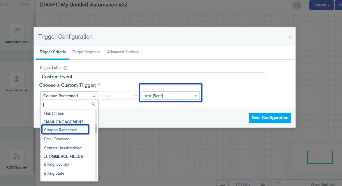In the automation builder, add the Custom Event trigger, choose Coupon Redeemed option and specify your email campaign.