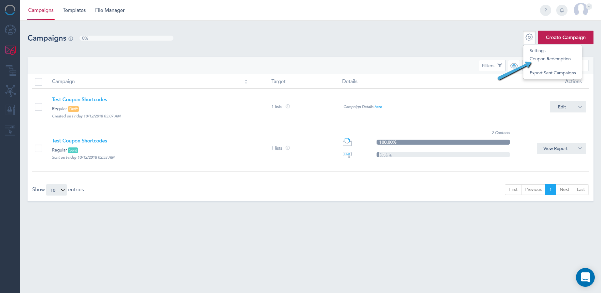 To redeem a Coupon Code, click the Gear Icon on the Campaigns Page. Select the Coupon Redemption option and enter the Coupon Code for the contact in the Textbox to redeem it.