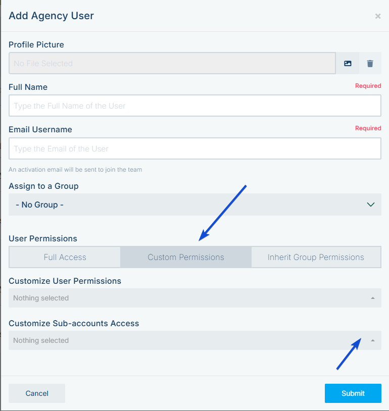 - To limit access to specific subaccounts or features, go to the Customize Permissions section. From there, select the desired subaccounts and permissions for the user.