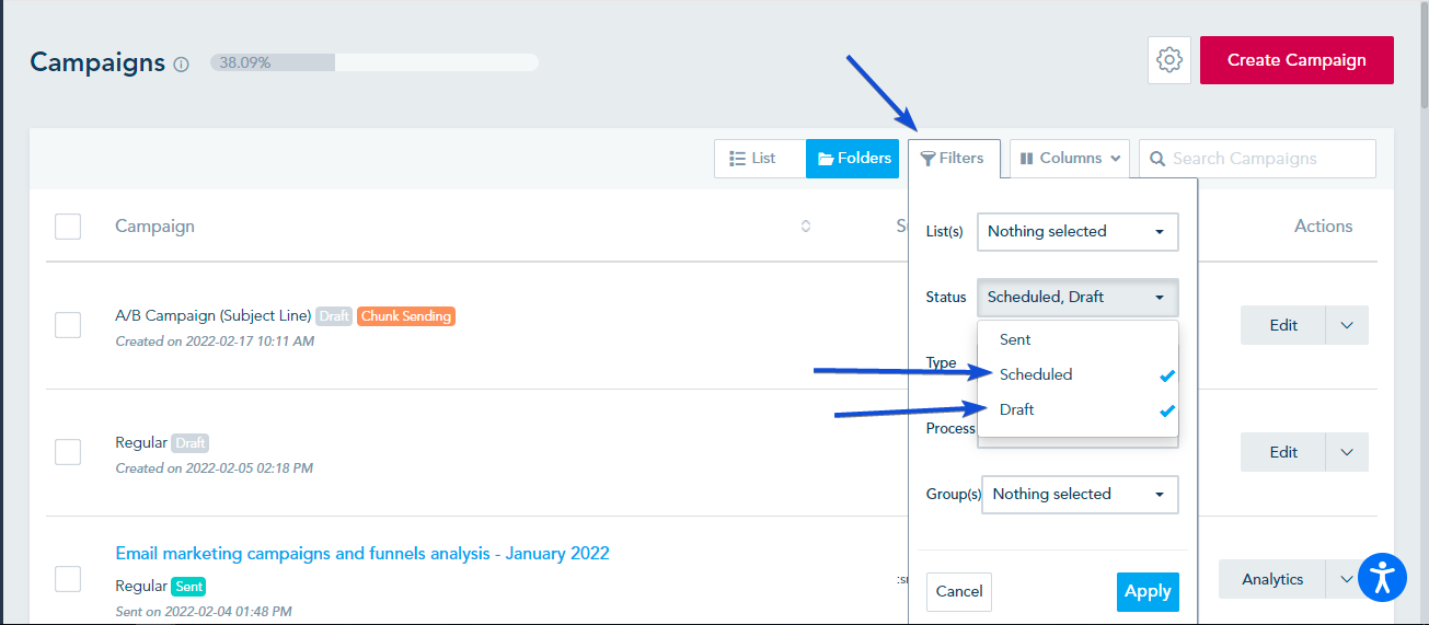 You can also sort campaigns by lists using the same filter option but instead of Status, use the Lists select field. Other sorting methods are by campaign Type (Regular vs A/B Testing), Process (Normal vs Chunk sending), or Groups.
