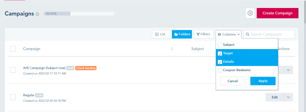 The Campaigns page also lets you manage your view and control how much information is displayed on the table view of campaign details. To change the view, click on the column drop-down and choose what you’d like to show/hide from the table columns.