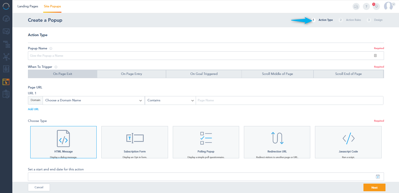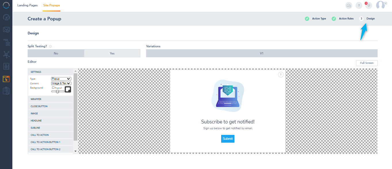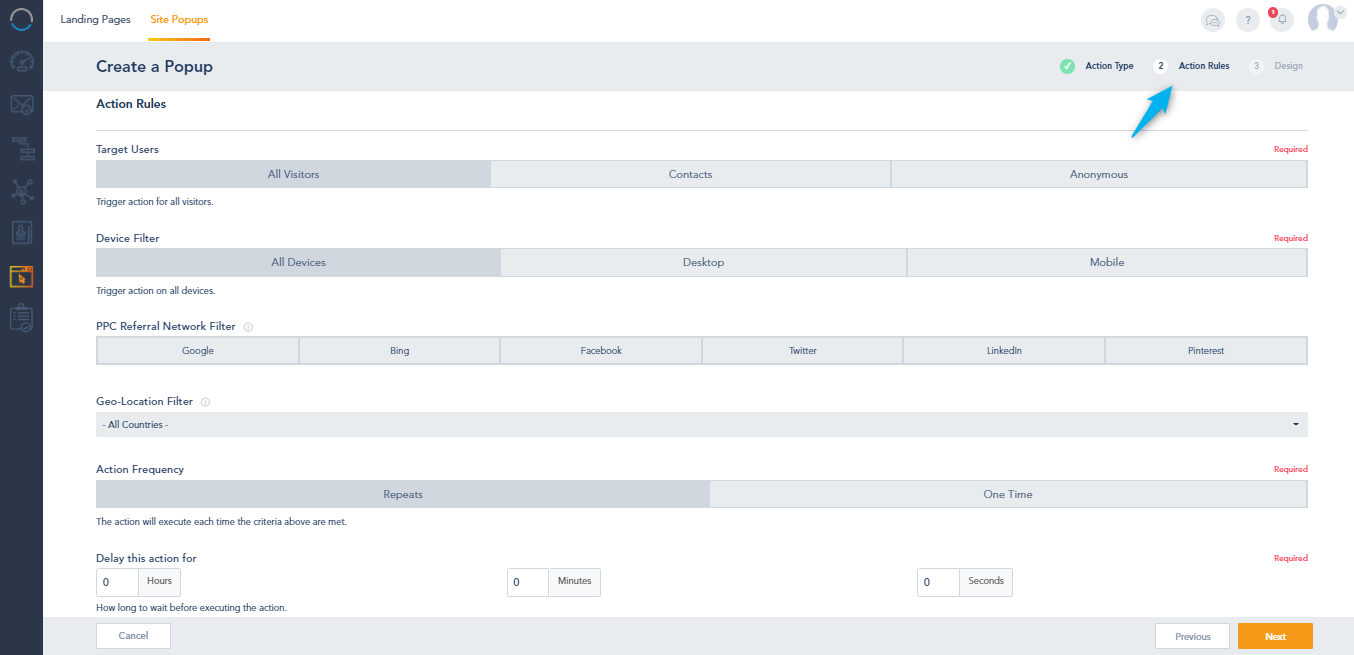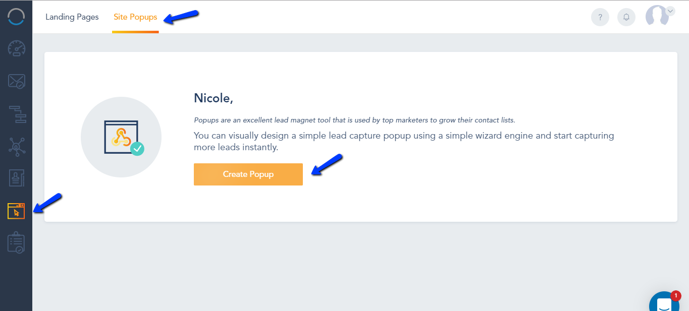 You can trigger smart popups and messages on your website by using the Site Popups feature available on your account. To get started with Site Popups, click on Landing Pages > Site Popups from the top menu.