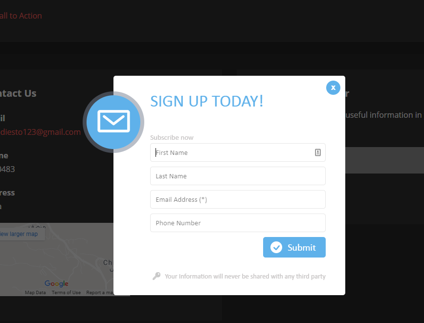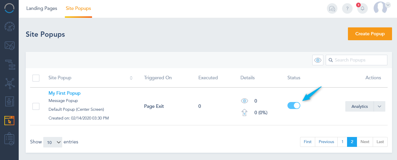 Once you save the Site Popup, you can control its status from the Site Popup screen. To disable the Site Popup toggle the on/off switch.