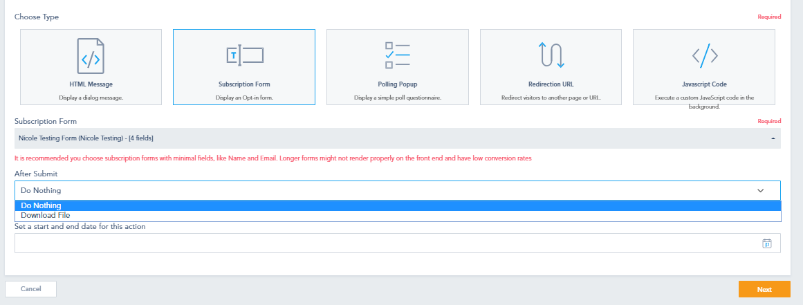 Choose Type: HTML message, Subscription Form, Polling Popup, Redirection URL, or Javascript Code.