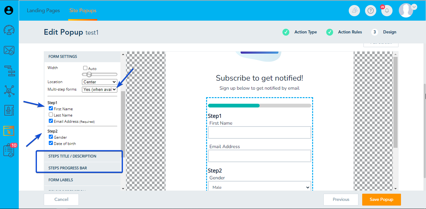 This is where you can visually edit your content, media and labels for that Site Popup. You can design the popup the way you'd like using the builder available on the left. Once you are done with this step, you can click on Save Popup.