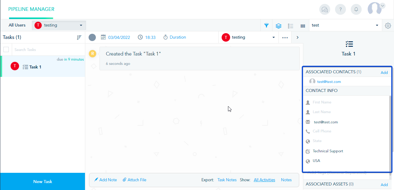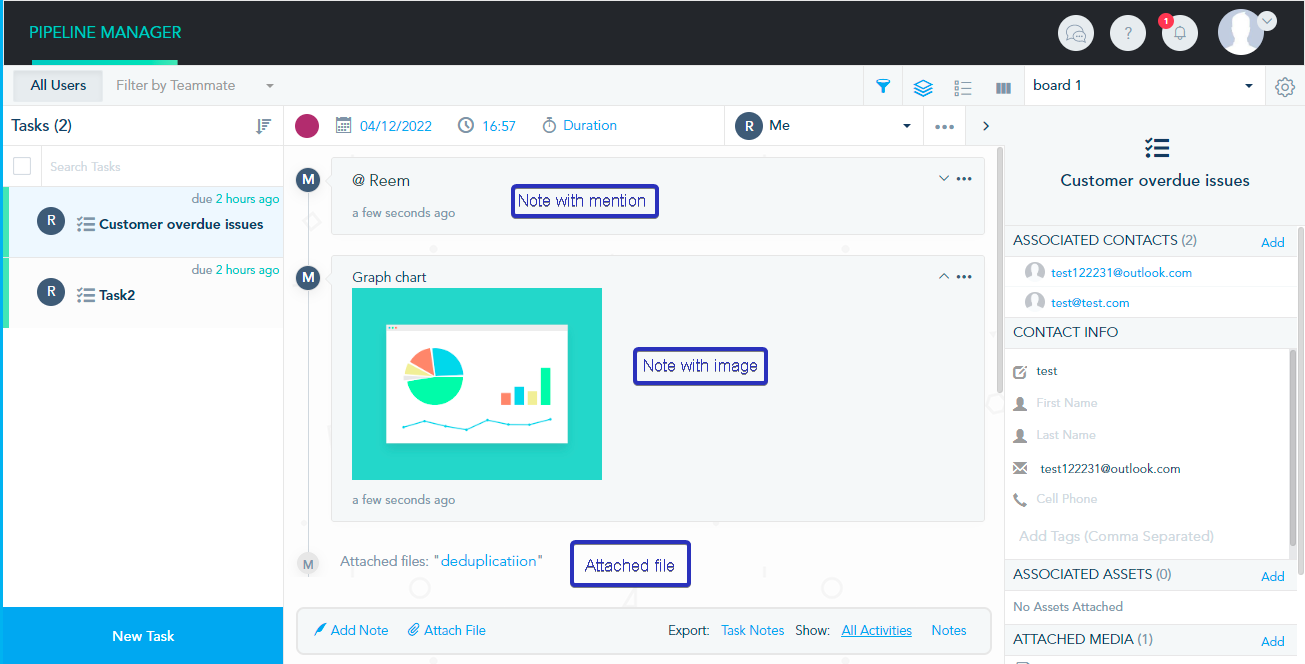 In this article, we will discuss Attached Files, Notes, Mentions, Assets, and Contacts for tasks created in Pipeline Manager: