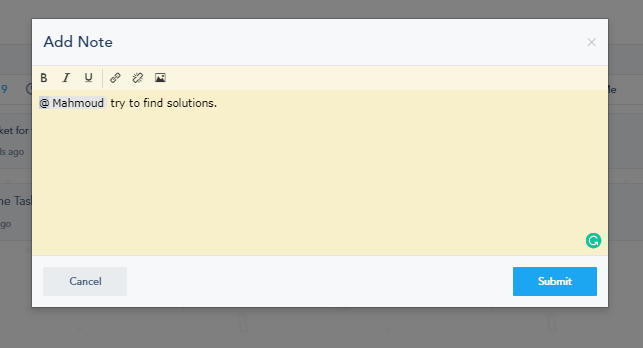 Add Note: Click on Add Note and write the Note, you can mention a teammate or Insert/edit image to your Note as shown above.