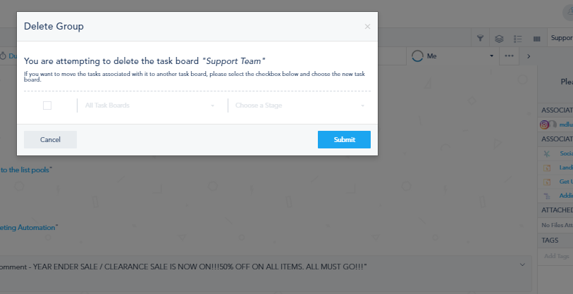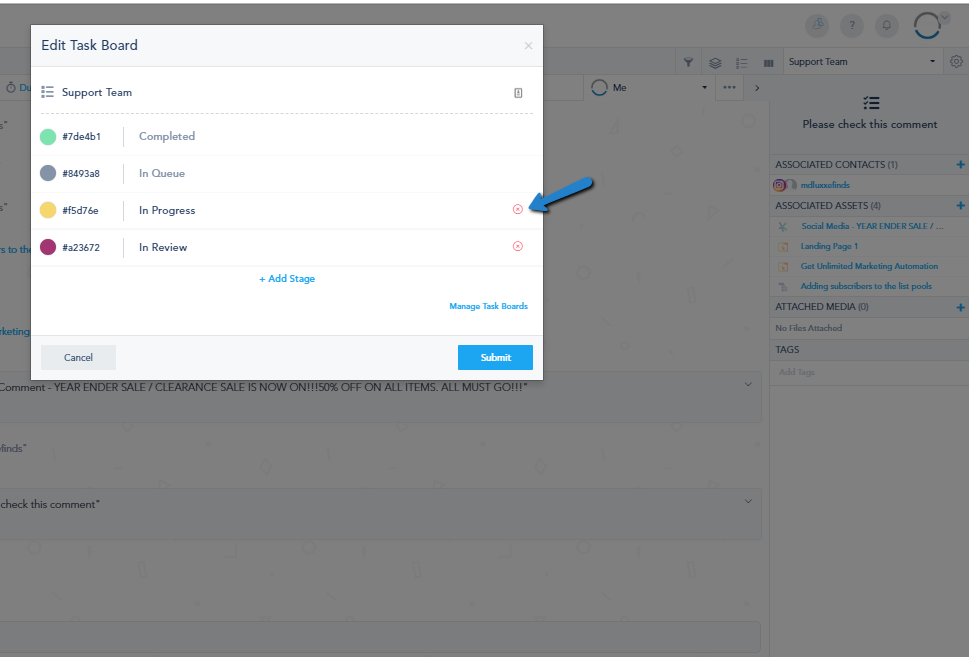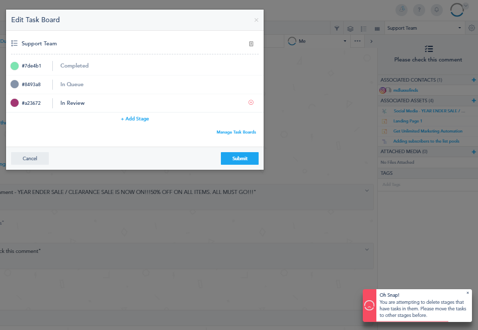 Note: After creating a Task Board and choosing its stages, you can't delete a stage that has tasks: