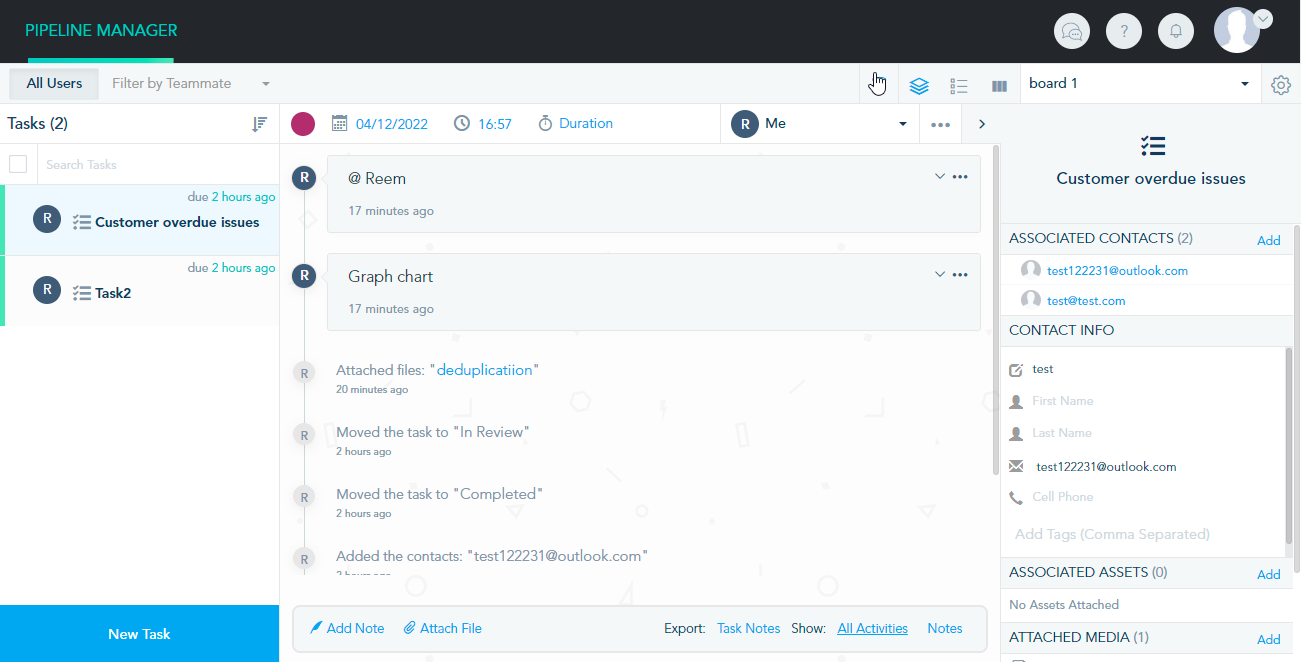 After creating a Task, you can monitor its progress, notes and media on the stream, where you can also view other Tasks, change Task Name, Type, Stage, and Open and Close Tasks: