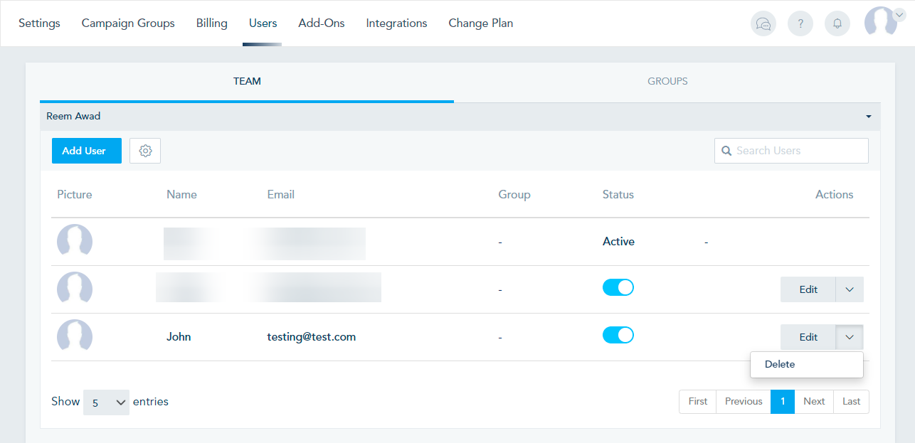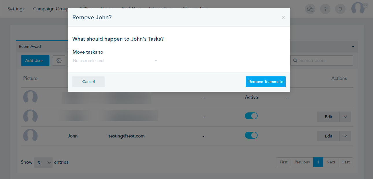 Note: If you delete a user with tasks assigned to him, you can move his tasks to another user: