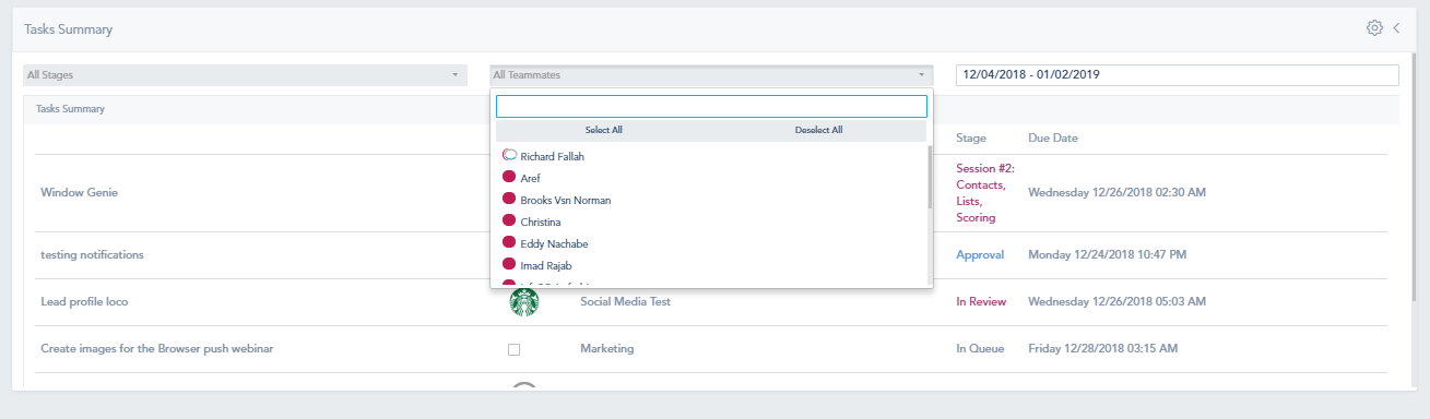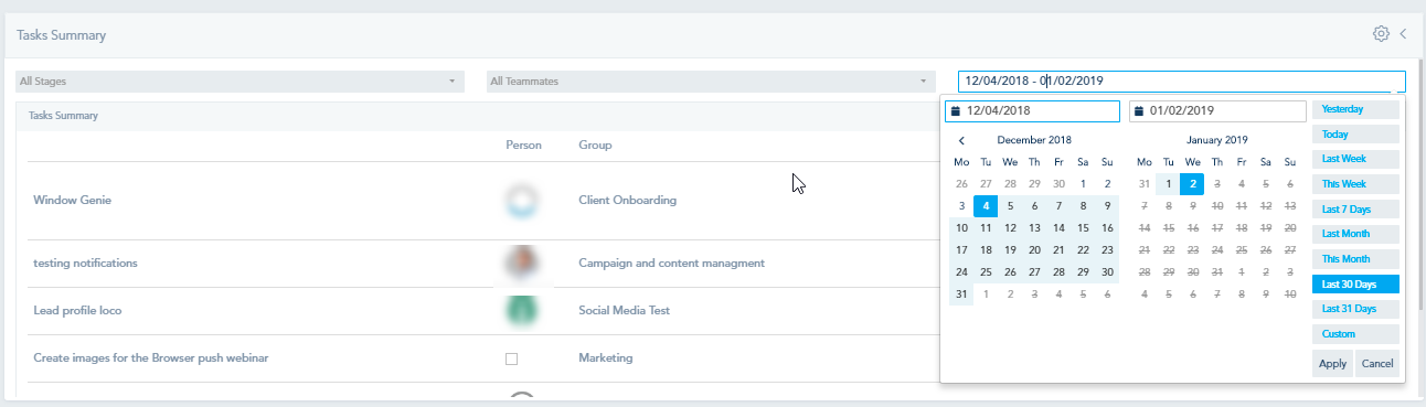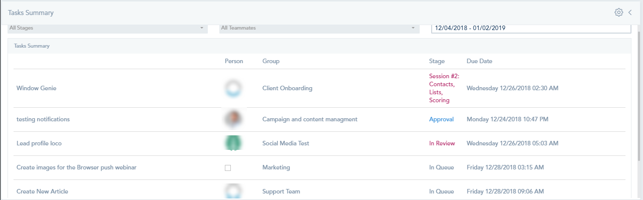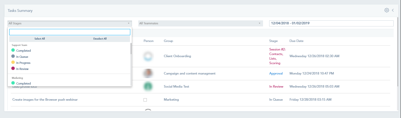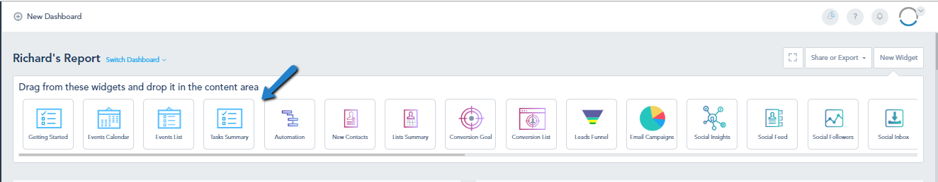 On your dashboard, click on the New Widget option and choose the Tasks Summary widget