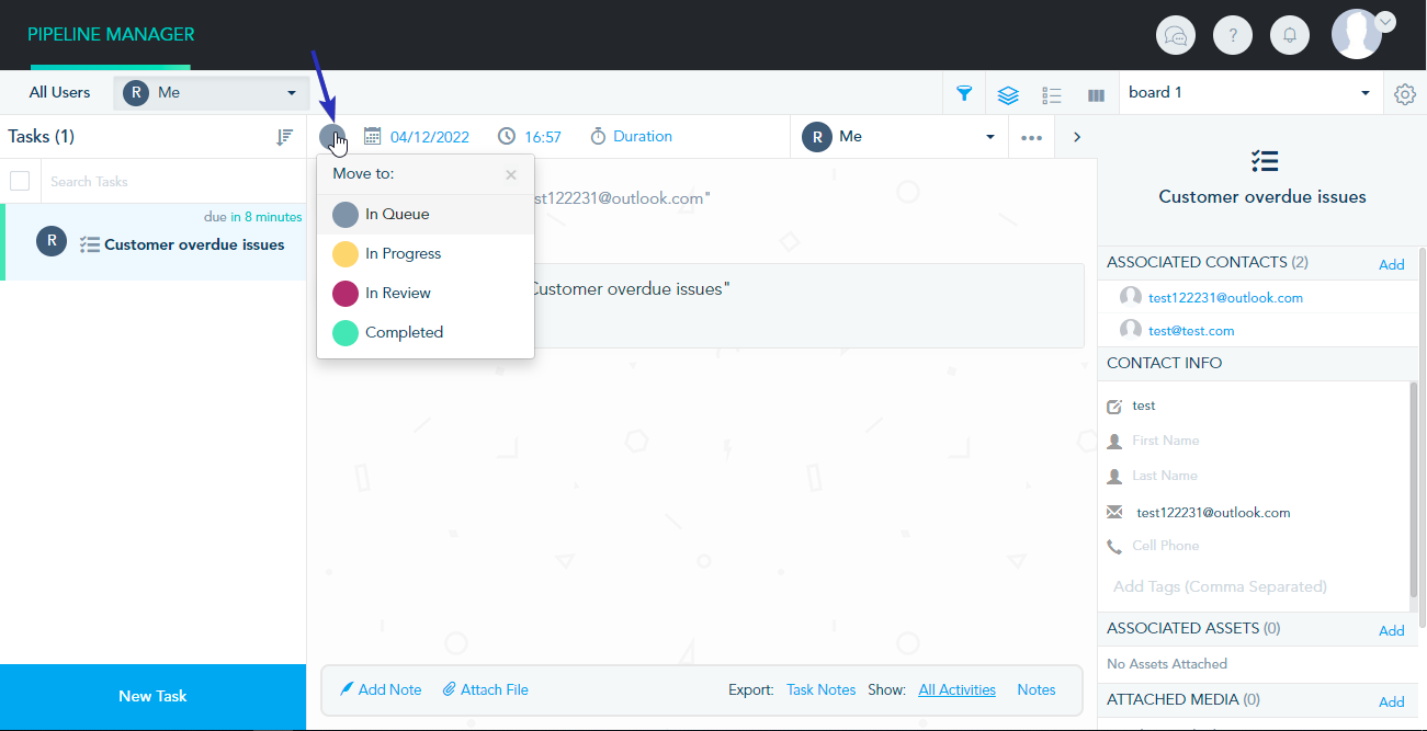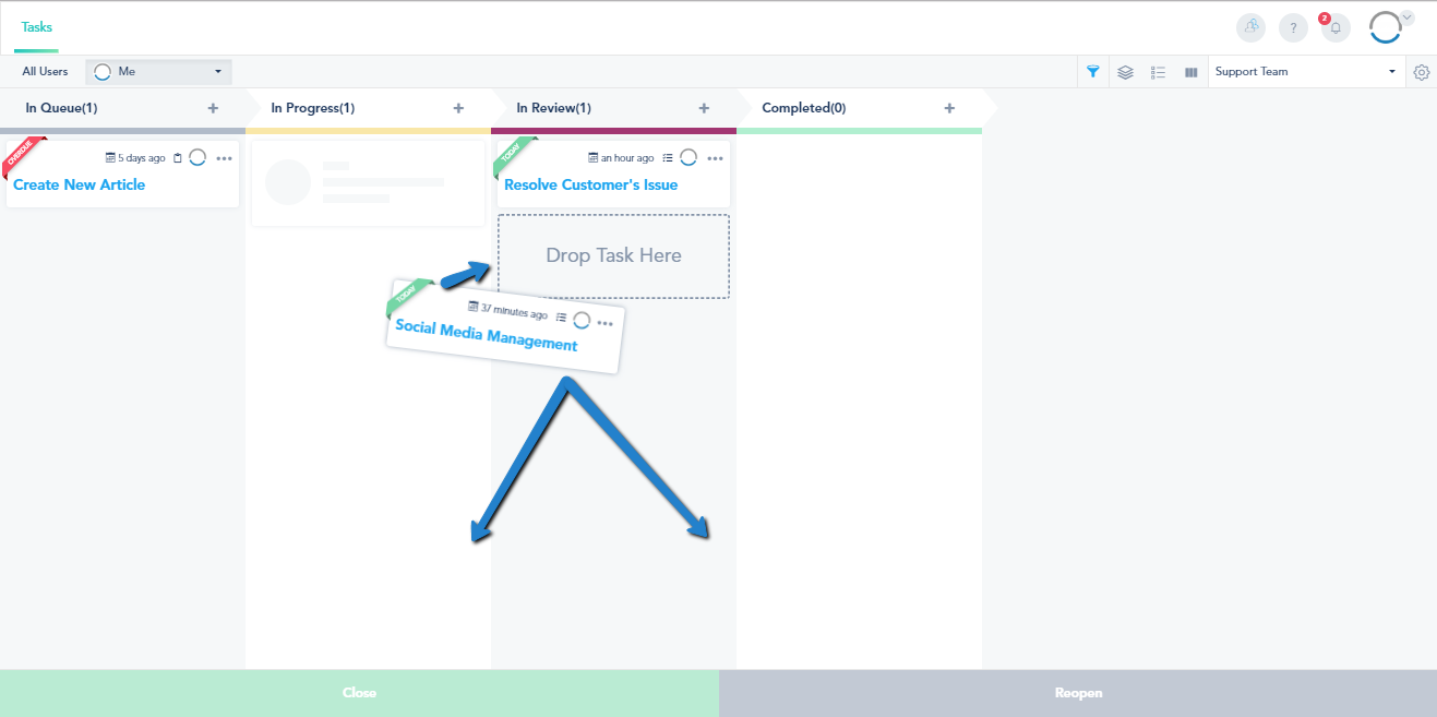 Use the Pipeline view to view tasks sorted into color coded stages, where you can drag and drop them from one stage to another. You can also drag them to the bottom default options: Open (defaults to In Queue) or Close (defaults to Completed).