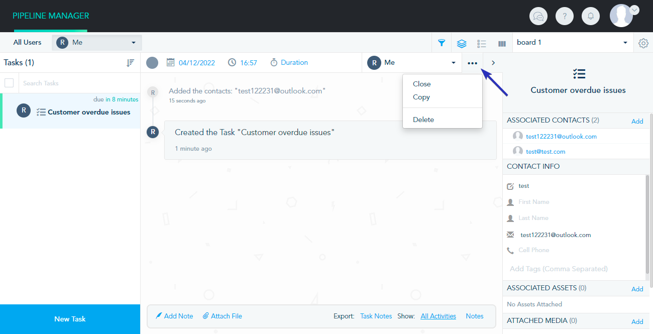 You can Close, Copy, or Delete the Task by clicking on the ... option from the top right of the task view: