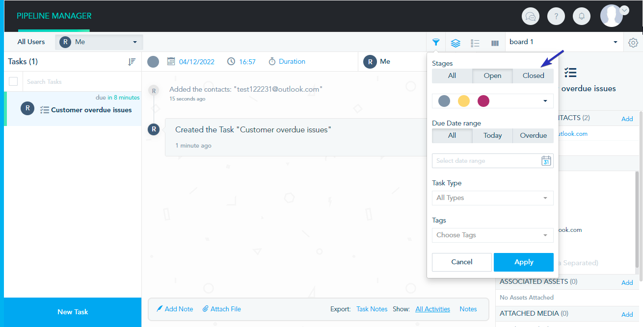 To access the available Filters, click on the Funnel next to Views. Choose to filter by Stages, Due Date, Tags then click Apply. If you choose Task Type, you might be prompted with additional filters (ex: If you filter by task type Deal, you will get an additional amount range option to include in your choice). Note that your filter options will be saved as your switch between the List, Table and Pipeline view.
