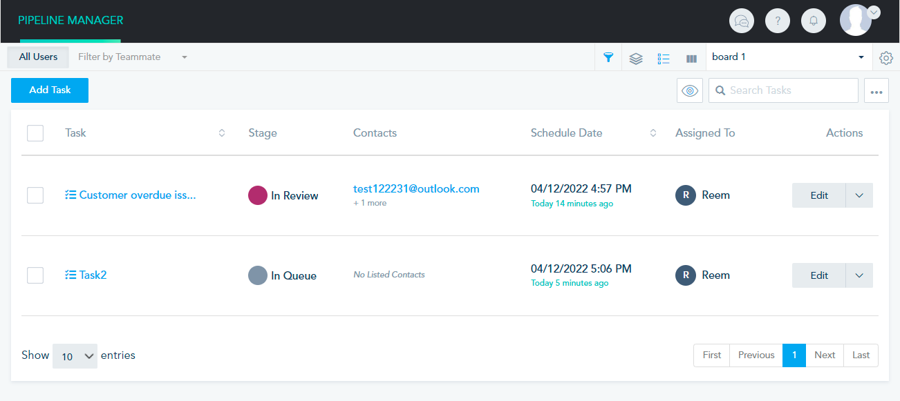 Your tasks will be sorted in a table format that summarizes each task name, stage, associated contacts, due date and the person assigned to the task.