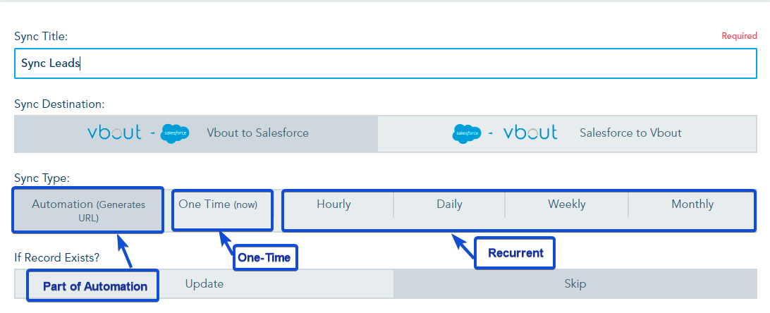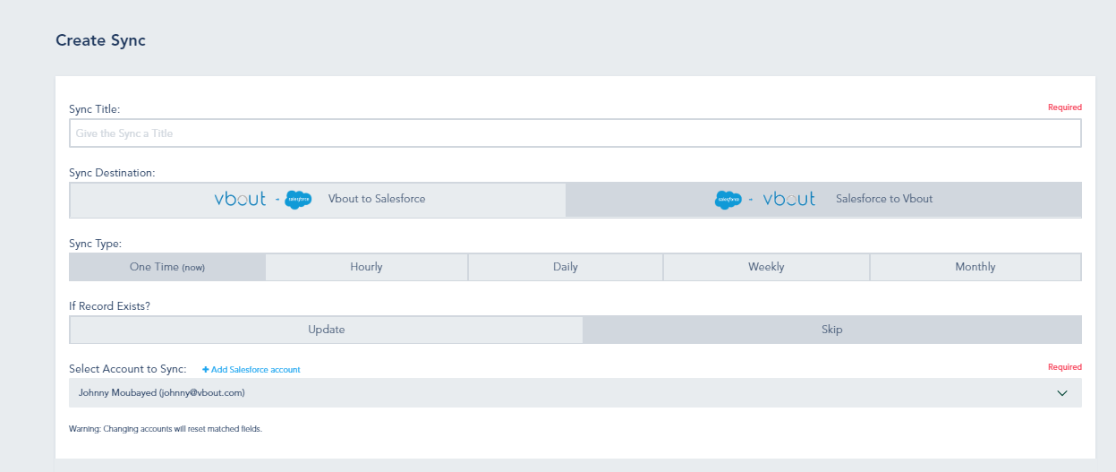 - Synching a lead from SF to VBOUT will be unique one time unless the email on VBOUT was set to NOT REQUIRED