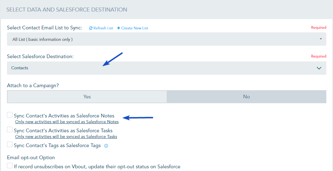 Afterward, Select Contact Email List to Sync and Salesforce Destination; you can choose to Sync contact’s activities as Salesforce Notes by clicking the checkbox: