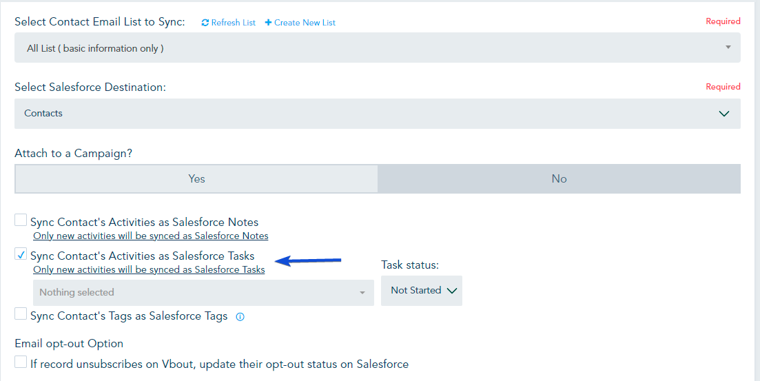 Also, you can choose to update the status of unsubscribe contacts in VBOUT to Opt-out in Salesforce.