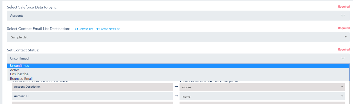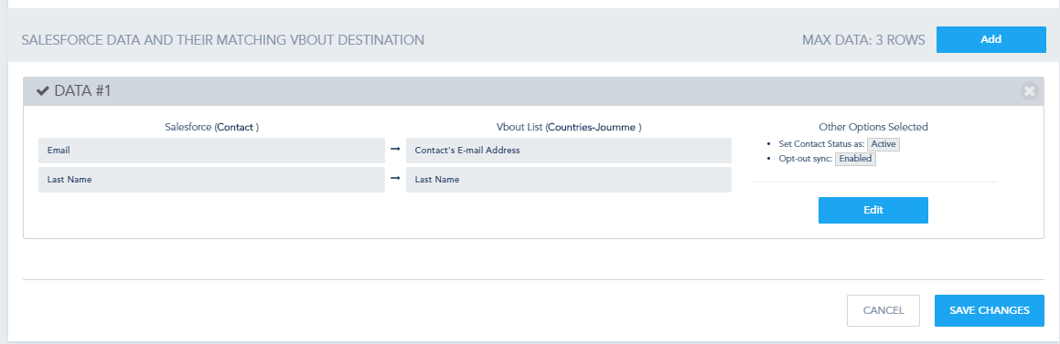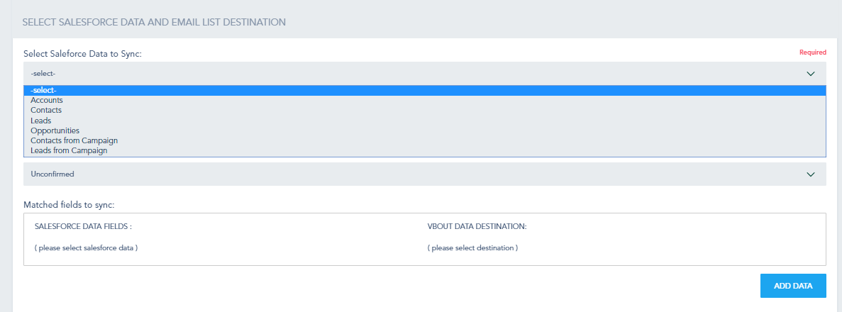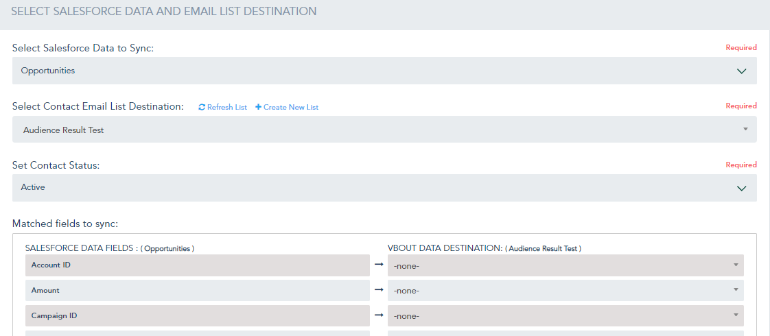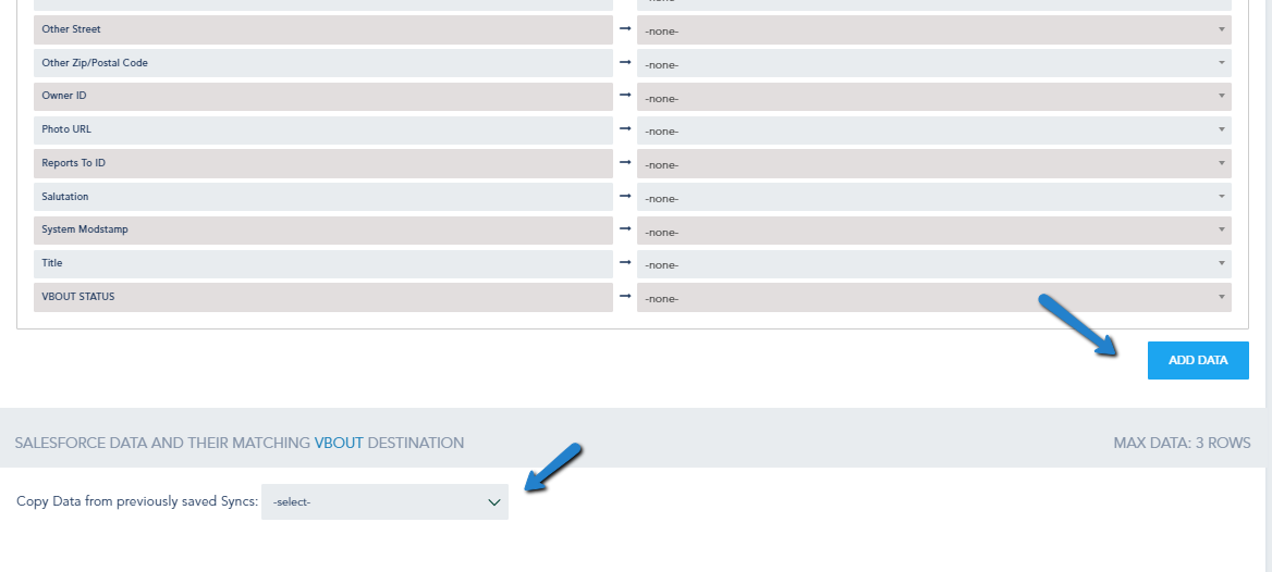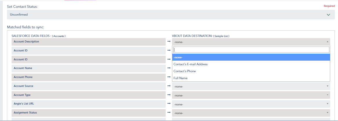 Once you finish these steps, you get to choose the VBOUT Data Destination for each Salesforce Data Fields: