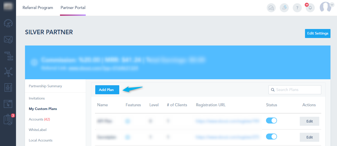 To add a new custom plan, you can click on My Custom Plans from the left partnership side menu, then click on Add Plan: