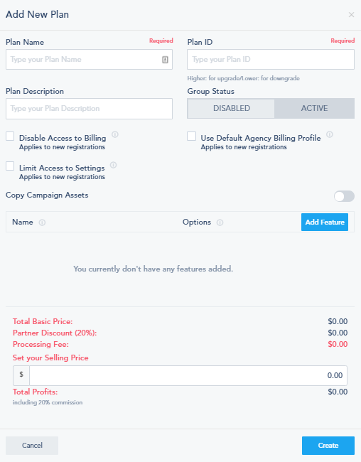 - The system will automatically display the total base price for the features you picked minus your discount as a partner. You also have the ability to set your own price for your customers and upsell the plans as you see fit. Total Profits = Selling Price - 0.3*(Total Base Price) - Processing fees.